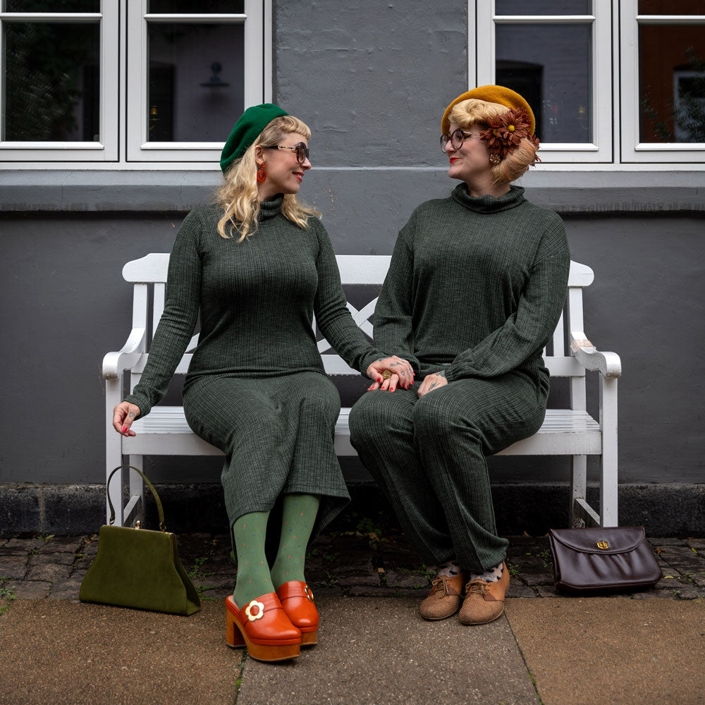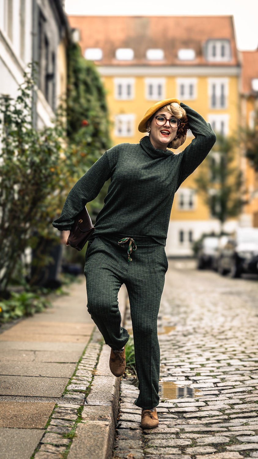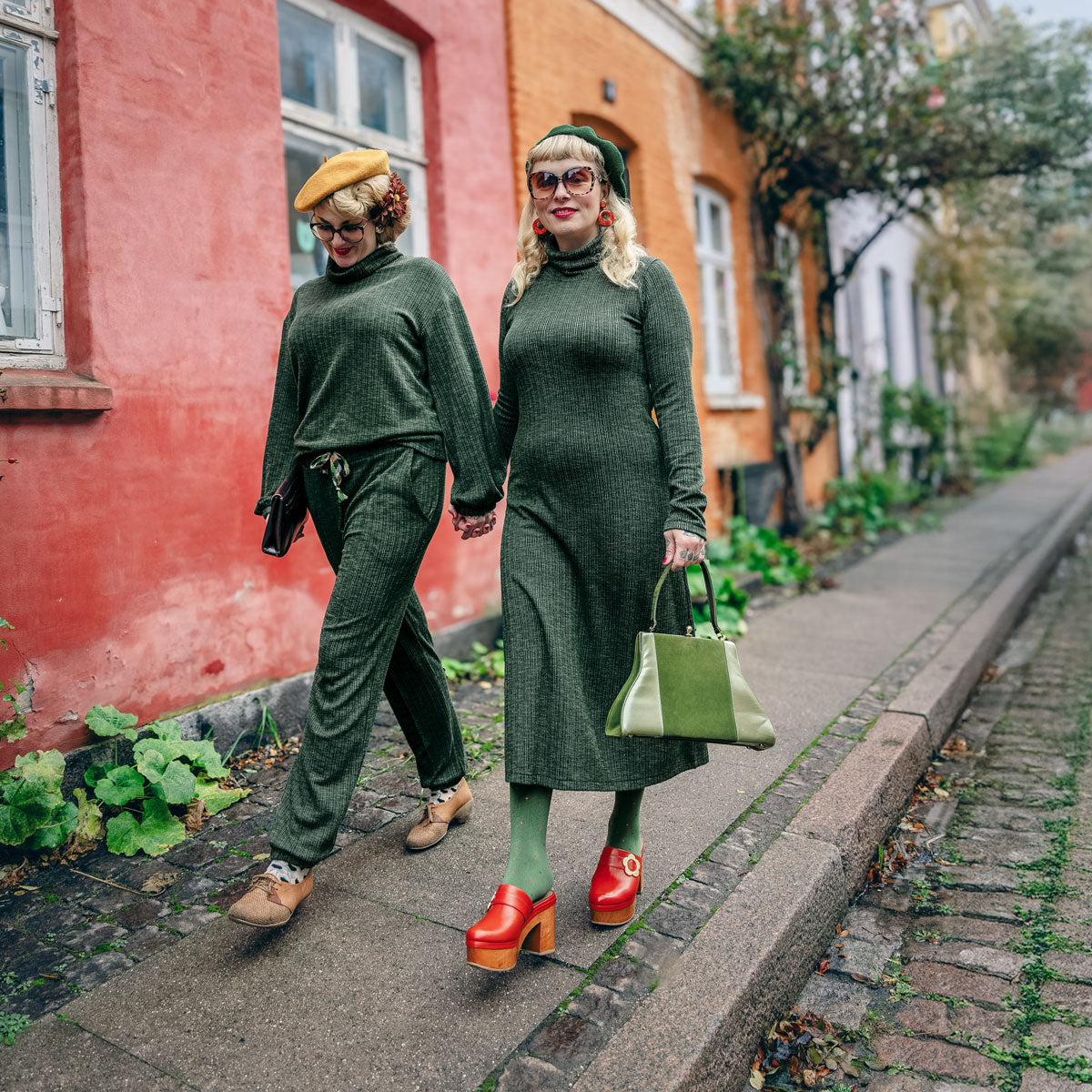 Den grønne farve går som en melodi gennem alt -tøj, hatte, strømper og stemningen.