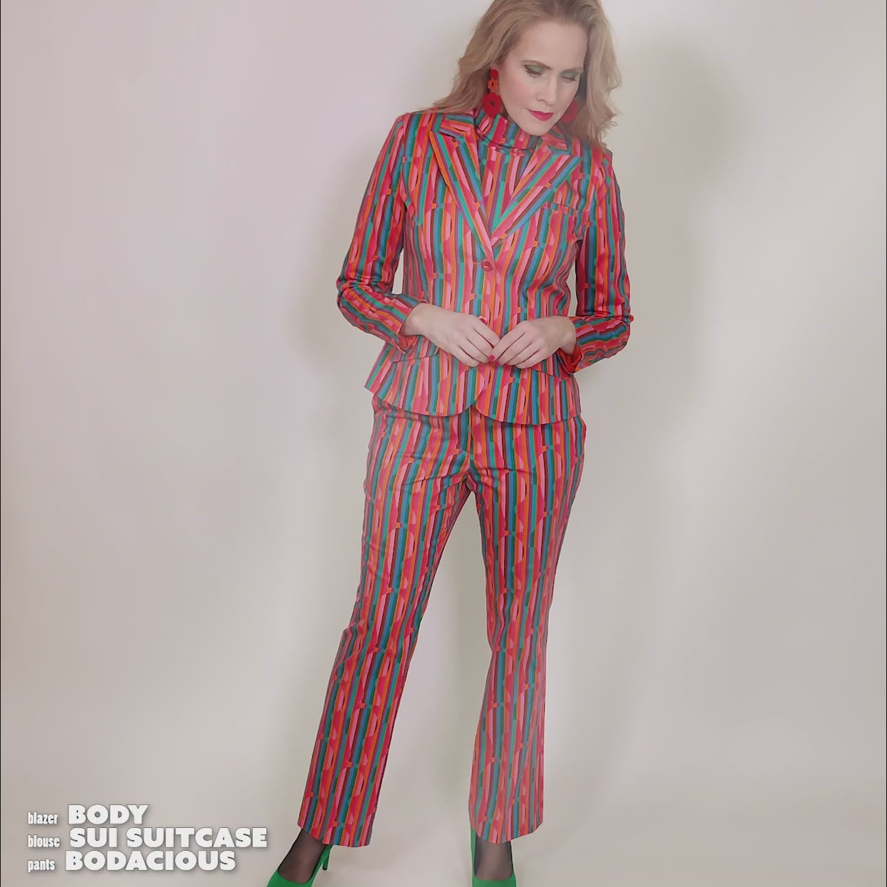 Totalt stilet enkelt-tradet og figursyet blazer med spidst revers og let skuldepude. Blazeren er lavet i en smuk kombination af pink og blålige farver i et grafisk mønster med skjulte ansigter og foeret med orange satin.
