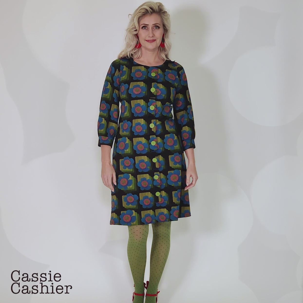 Lækker kjole i flot retro mønster i grønne og blålige nuancer. Kjolen dekoreres af kantede buer med grøn knapper hele vejen ned foran. Ærmerne er med manchet og 3/4 lange.