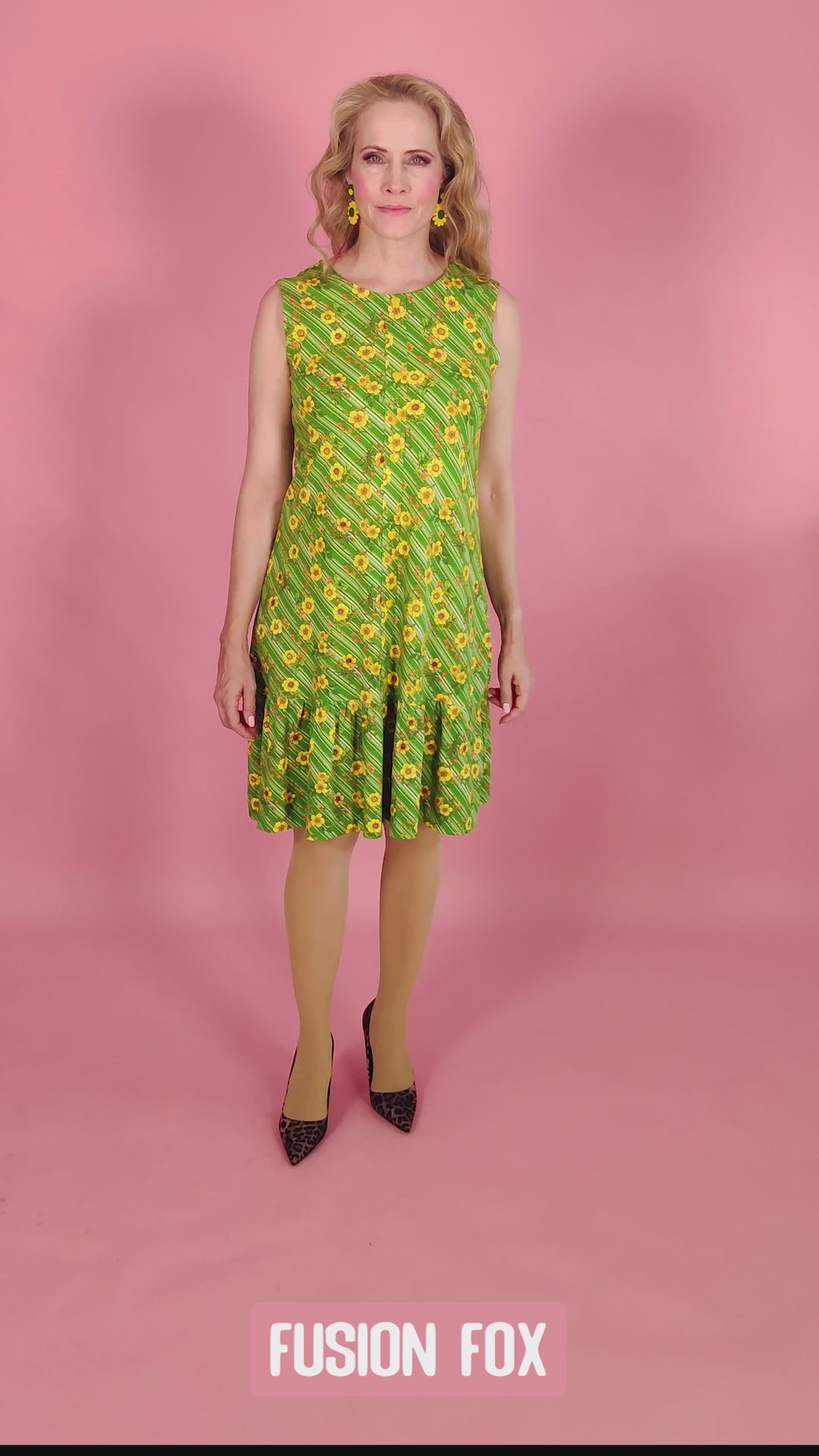 Ferieklar A-shaped midi grøn kjole med creme striber på skrå og gule blomster mønster. Fin bådhals udskæring og søde gule hjerte knapper mid front. Kjolen er uden ærmer og har et bredt parti med flæser forneden på kjolen.
