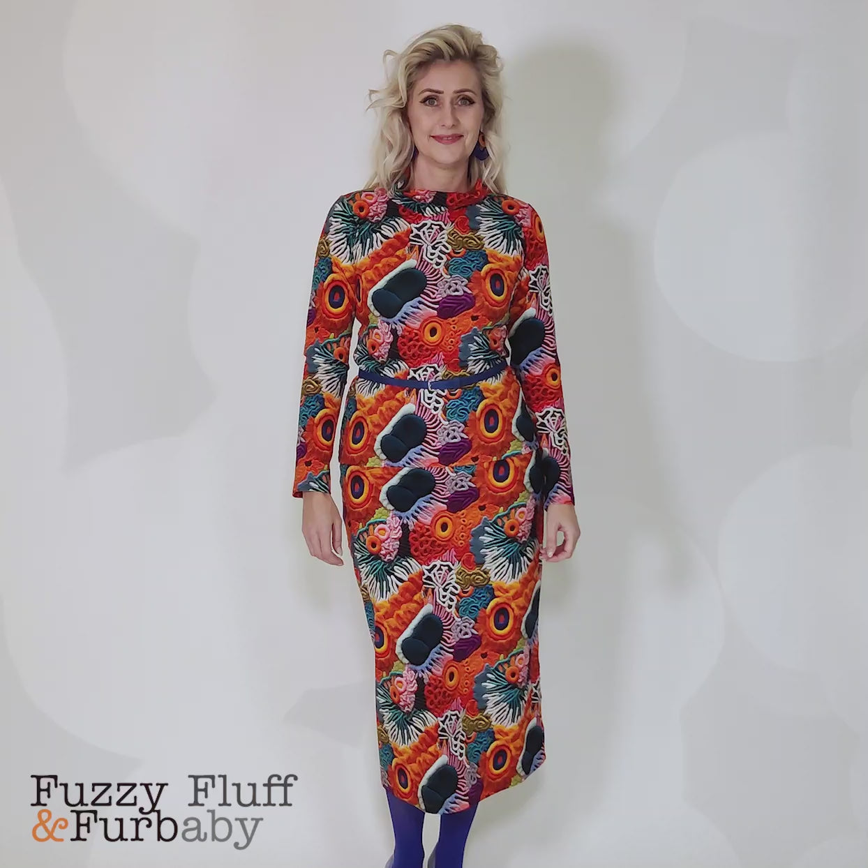 Super fed langærmet bluse i strækstof med rullekrave og fantastisk mønster i dejlige farver.