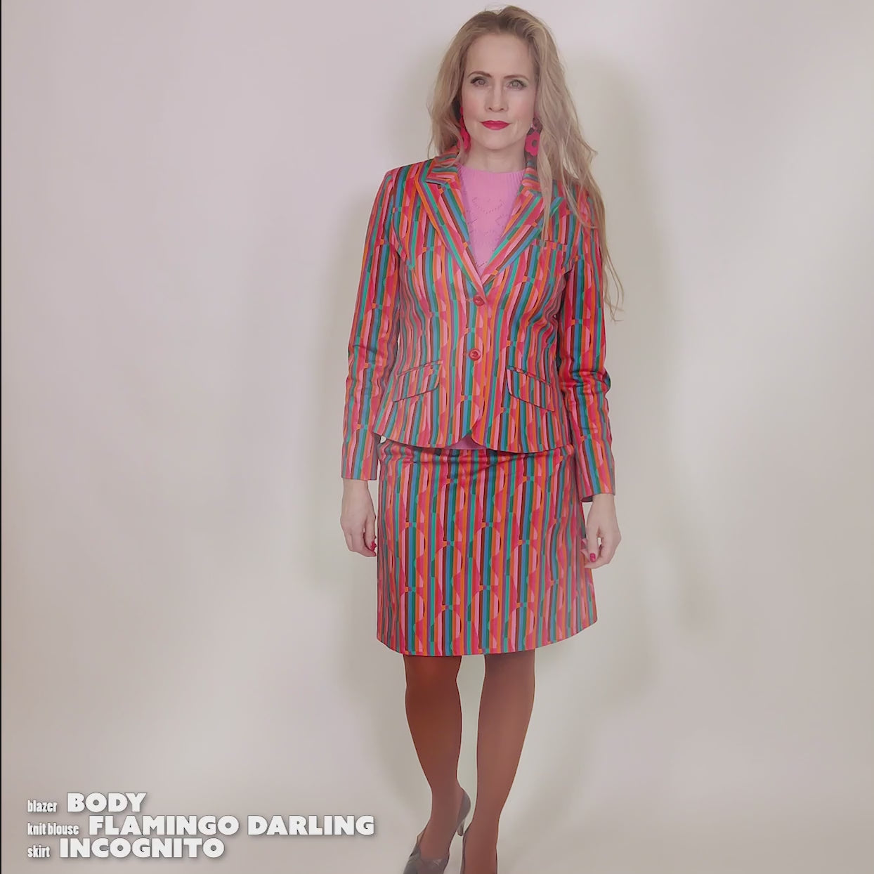 Super smuk a-formet nederdel i farvestrålende stribemønster i pink og blålige nuancer med skjulte ansigter. I livet er der et rødt pyntebånd med små hvide prikker. Der er både baglommer og sidelommer på nederdelen som lukkes med lynlås bagpå.