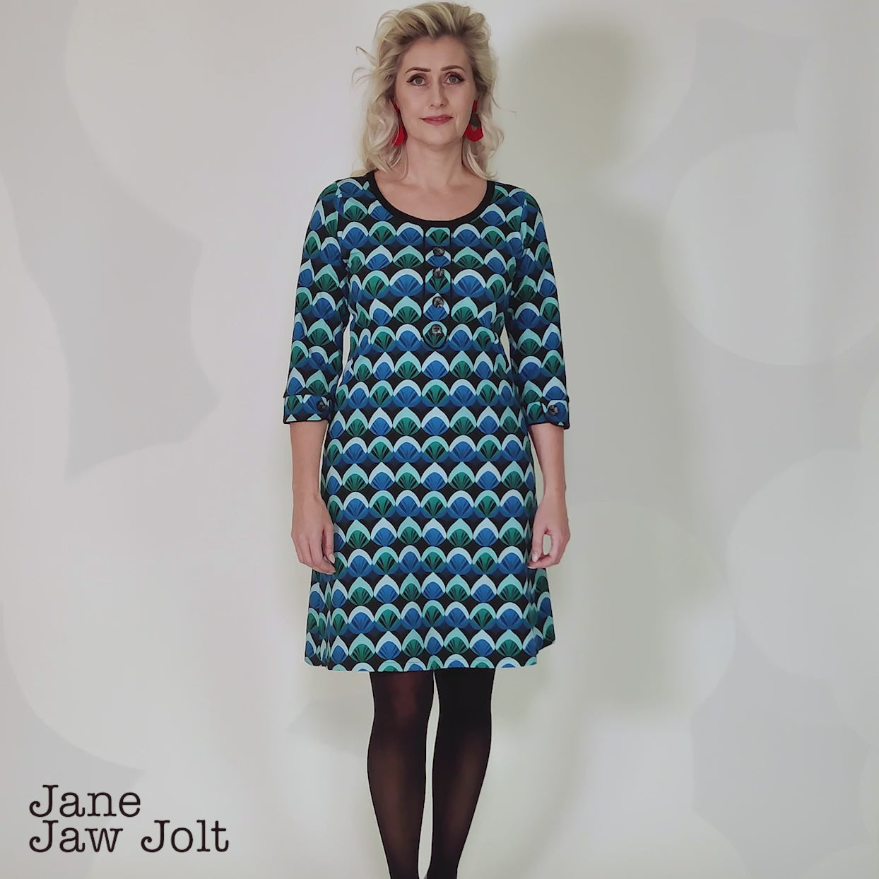 Sød kjole med retroprint i blålige nuancer. Ærmerne er 3/4 lange med knap og fold detalje forneden. Udskæringen er rund og indrammes af sort kantebånd. Ned ad brystet prydes kjolen af 4 sorte knapper.
