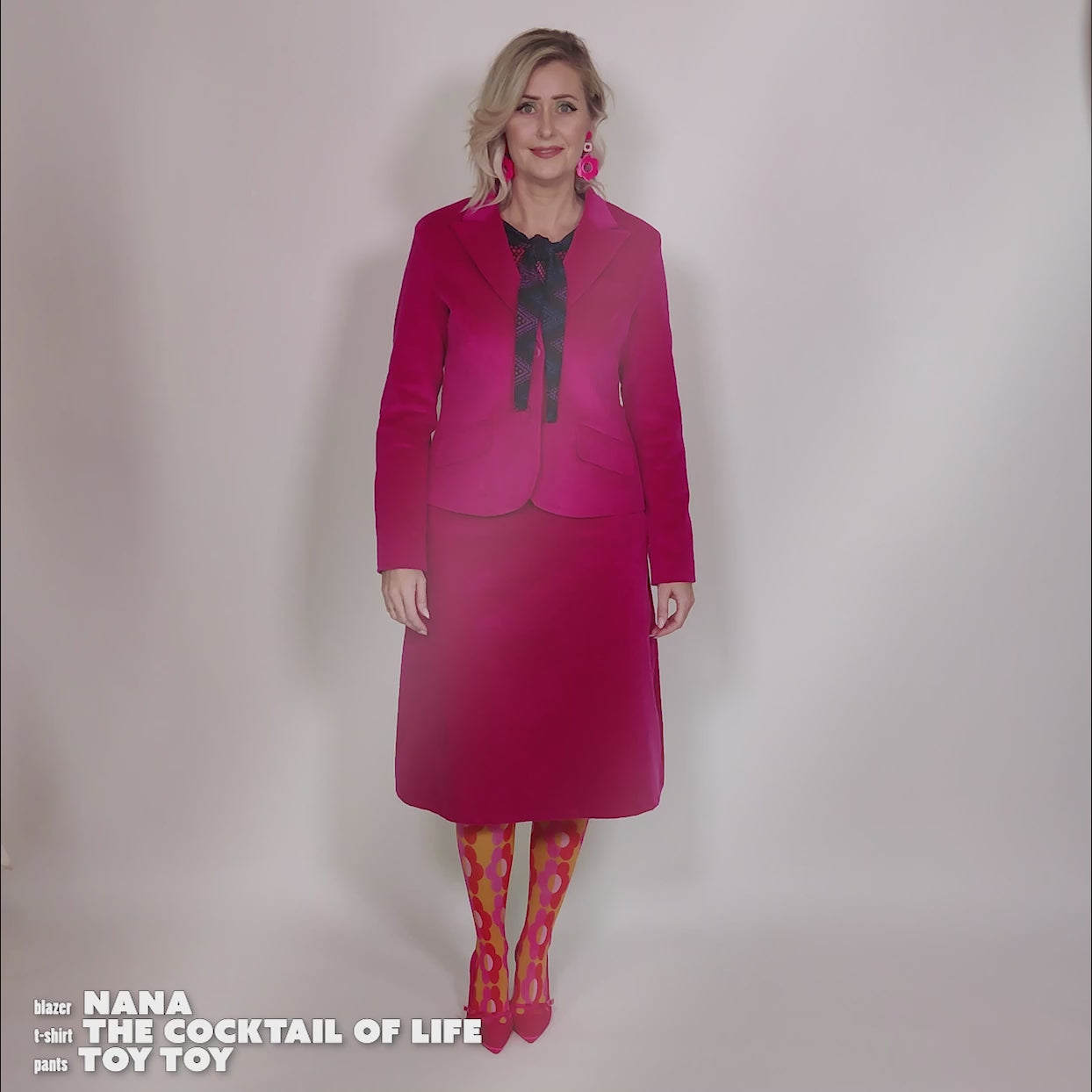 - Astrid A. bluse, Nana blazer, The Mod Flowers strømpebuks og Pink Lulu øreringe til stylen