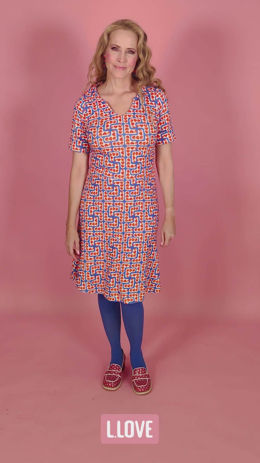 Feminin, finurlig og ren hjerte beskriver meget godt denne kjole. Printet er L'er (L for love) med røde hjerte i på blå baggrund. Kjolen har rundet krave, rund udskæring og har korte ærmer med ombuk. Den skæres i taljen og skørtet er lidt trompet formet.