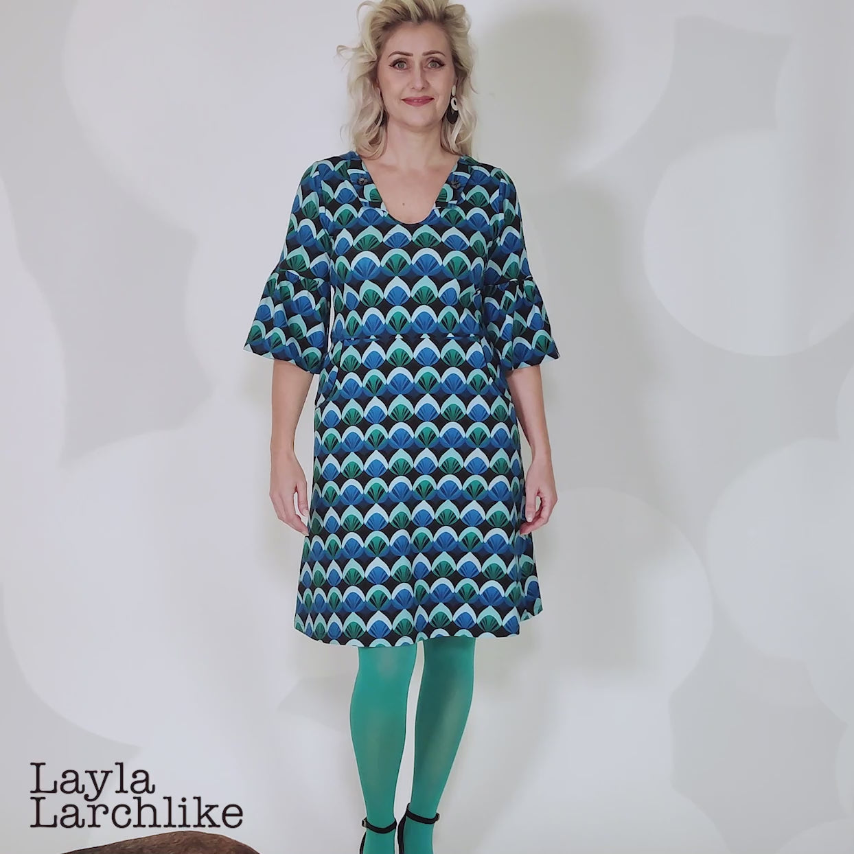 Elegant kjole i retro grafisk mønster i blå nuancer. Kjolen har 3/4 lange ærmer i trompetform. Den er skåret i taljen og har lommer.