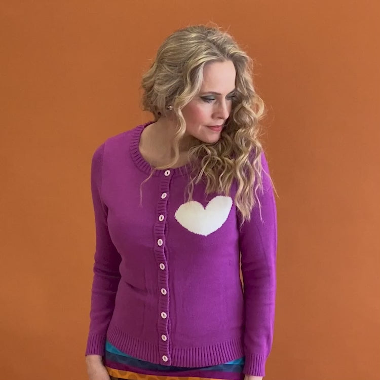 Purplelove er en feminin strikcardigan med creme hjerte. Den hører ind under vores basic models og findes i mange farver. Den er super blød og behagelig at have på. Pasformen er normal med synlig front knapper og rib. Den er ideel til at bruge over andet eller som bluse.