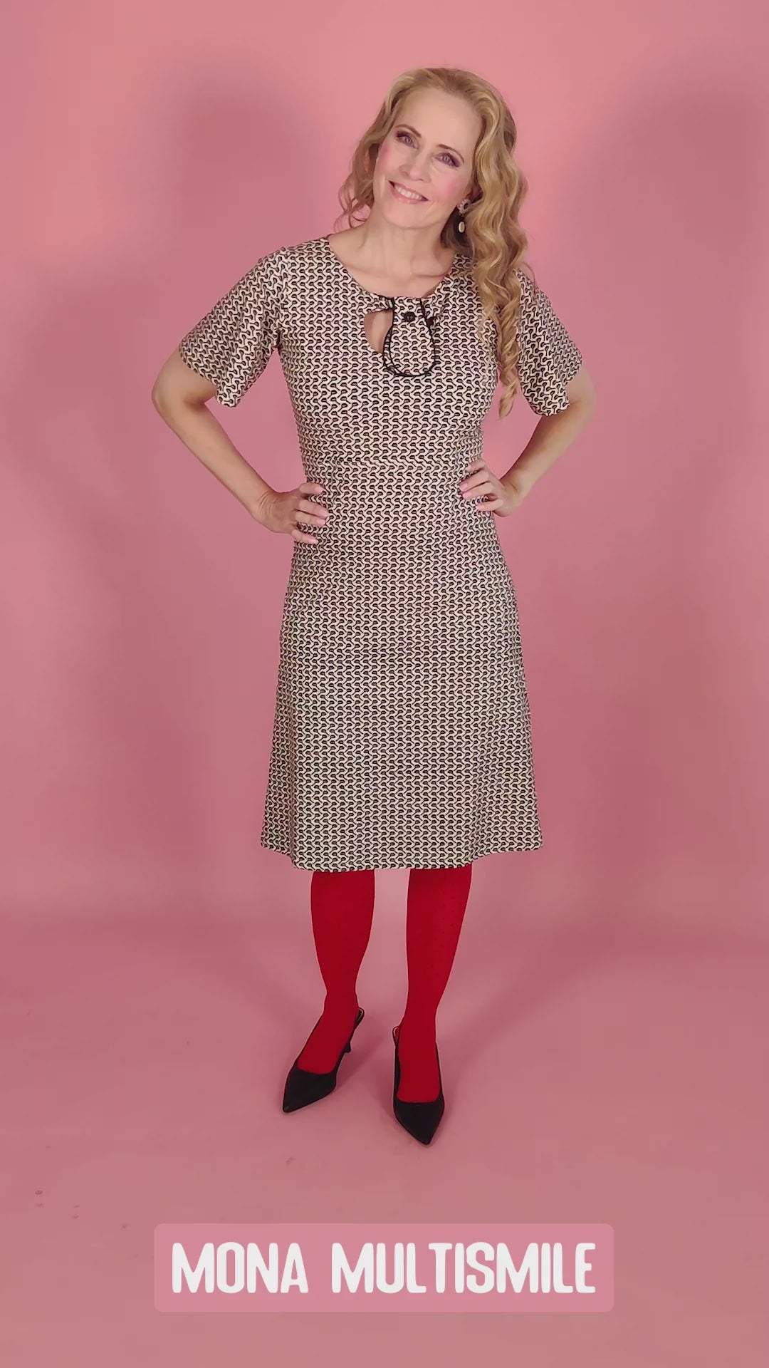 Elegant og kropsomfavnende kjole i fedt læbe og læbestiftsmønster i sort og creme. Kjolen har rund udskæring med cutout og super funky lille slipsdetalje der kan knappes af og på som man ønsker. Ærmer er semi-korte og flagrende og kjolen har lommer.