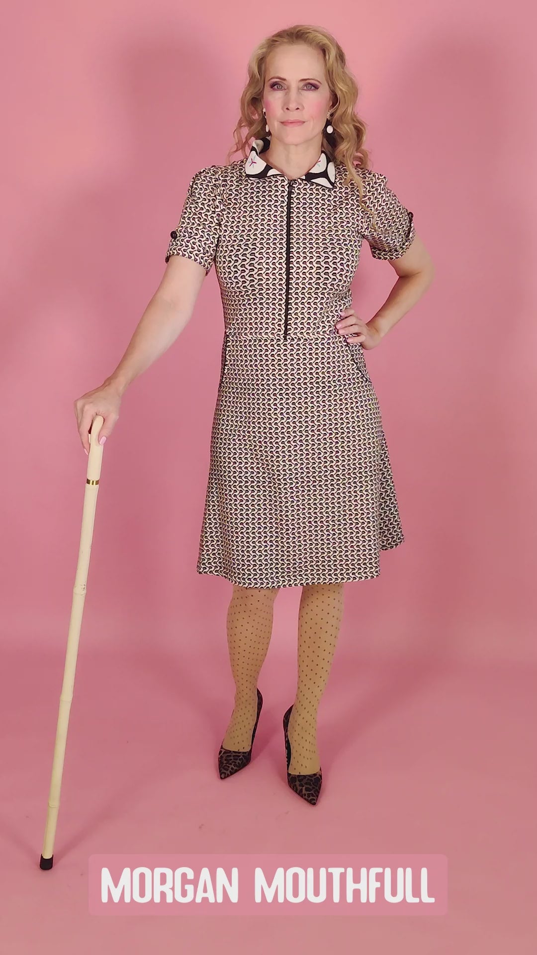 Super fin kortærmet kjole i et super fedt læbe og læbestift mønster i sort og creme. Kjolen har lynlås fra hals til under bryst og smuk krave. Kjolen skæres i taljen og har lommer. Lommerne i american diner servitrice outfit style med opbøjet manchet med knap.