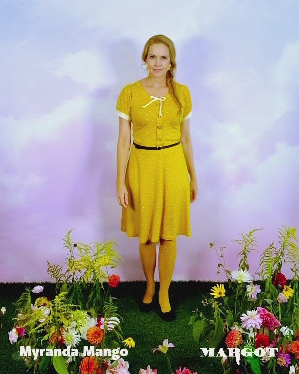 Lækker kjole i gult tekstil med hvide prikker. Kjolens udskæring prydes af lille hvidt bindebånd, ærmerne er korte og i gult meshstof med gule prikker og hvid manchet. Kjolen har 4 knapper nedad bryst og talje og skæres her. Kjolen sidder til ved bryst og talje mens skørtet har vidde.