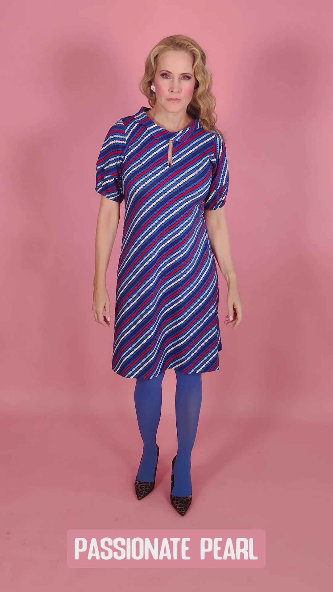 Retrolækker kjole med skrå perle mønster i blå nuancer med et pift af rød og creme. Kjolen har en flot bådhals med krave og lille elegant cutout over brystet. Ærmerne er semi-korte puffede med elastik og kjolen er rummelig fra brystet og ned.