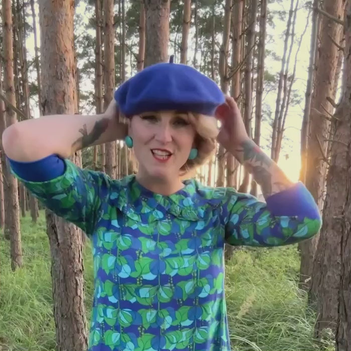 - Vi har valgt Foxy strømpebuksen og Super royal på image billedet, øreringene er Wildflower.