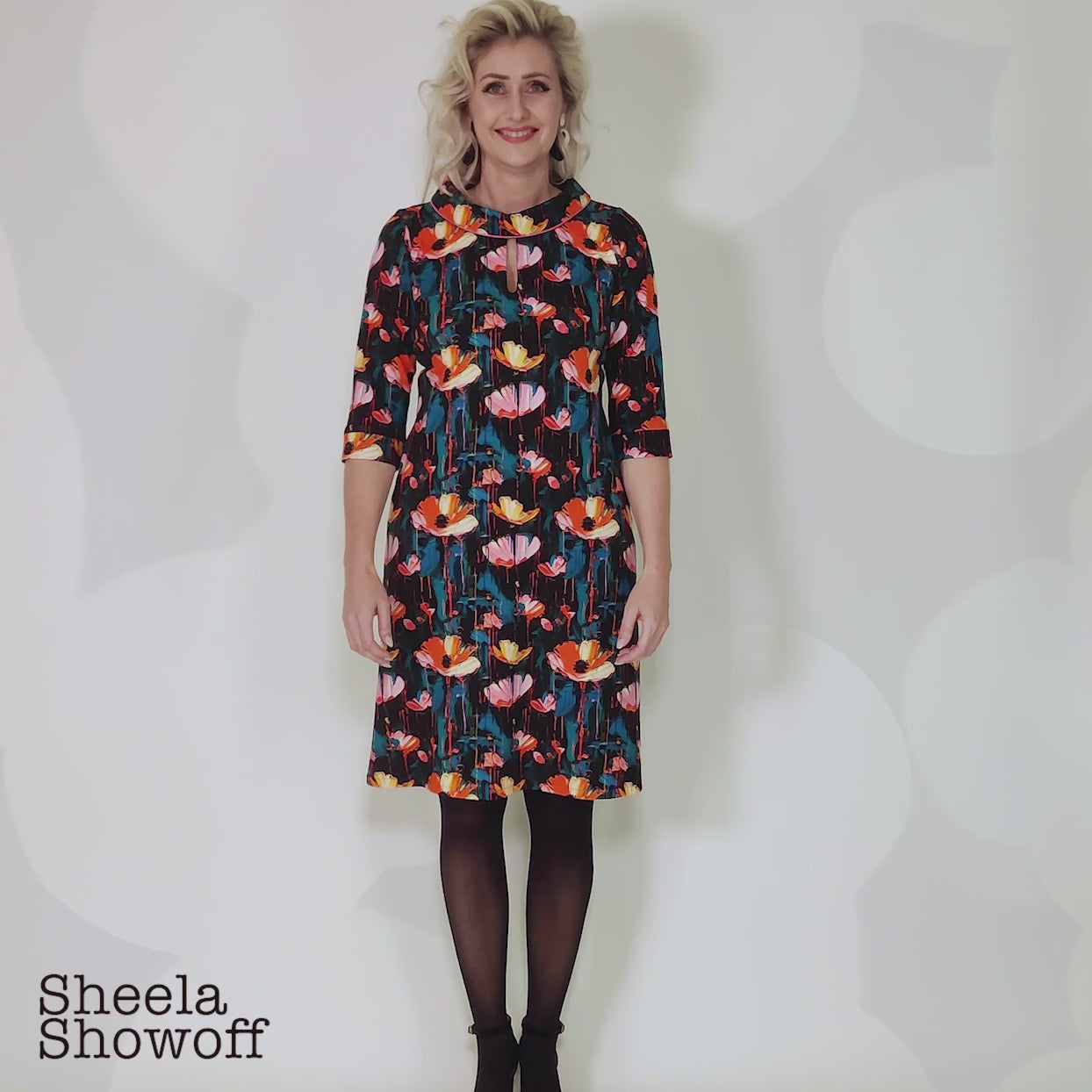 Retrolækker kjole i malet blomstermønster. Kjolen har en flot høj bådhals med smalt lyserødt kantebånd og lille elegant cutout over brystet. Ærmerne er 3/4 lange og Kjolen er rummelig fra brystet og ned.